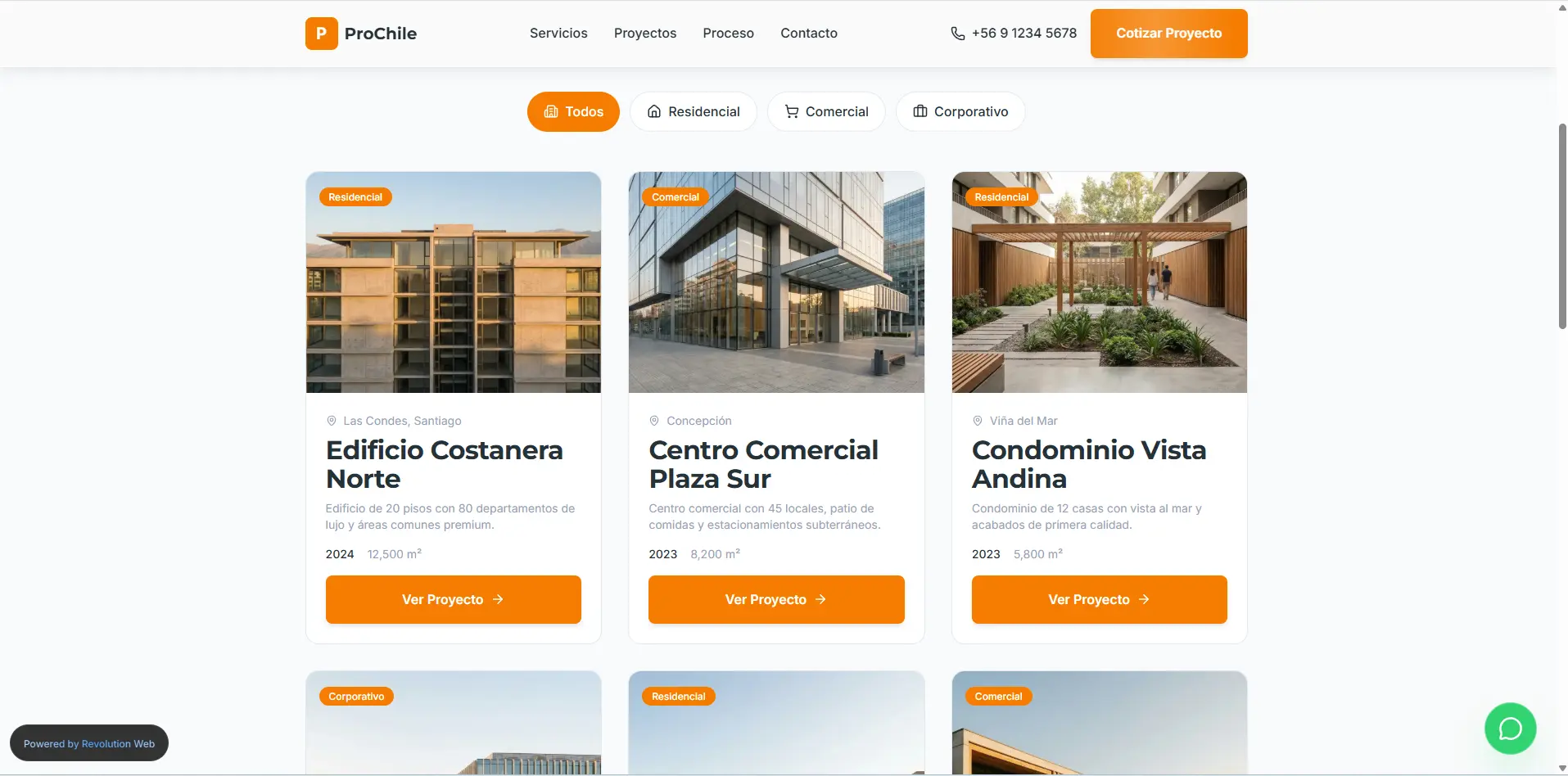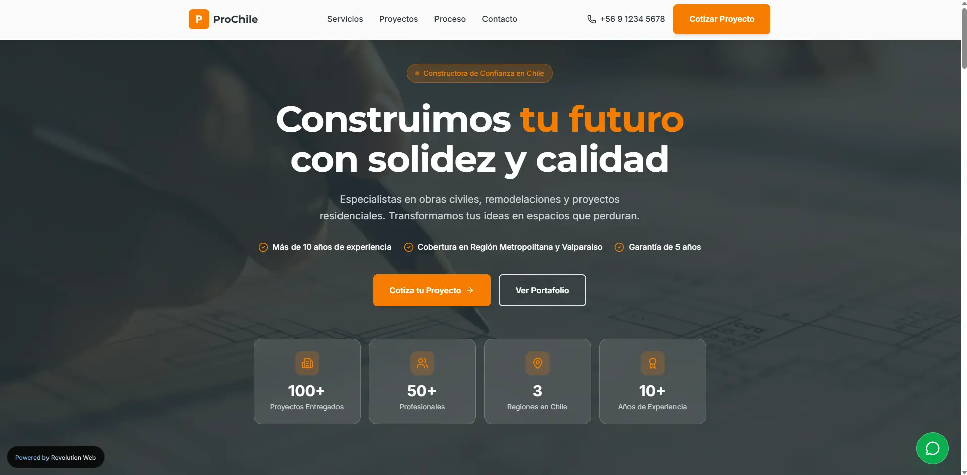 Constructora Pro Chile es una demo conceptual desarrollada para representar el sitio web de una constructora ubicada en Santiago. El proyecto presenta una imagen sólida, profesional y confiable, pensada para empresas del rubro construcción que necesitan transmitir experiencia, seriedad y capacidad técnica desde el primer contacto digital. La estructura del sitio prioriza la claridad de los servicios, la credibilidad del negocio y una comunicación directa orientada a proyectos reales.